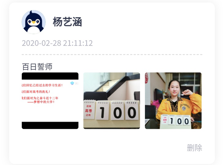 “生于非典,考于新冠,2020,我們注定不凡!疫情當(dāng)前,雖然我們隔離在家,不能像往屆那樣,齊聚學(xué)校體育館舉行誓師大會(huì),意氣風(fēng)發(fā)地走進(jìn)學(xué)校精心準(zhǔn)備的“成功門(mén)”,伴隨奮進(jìn)的樂(lè)聲高喊出我們的誓言,在“簽名紀(jì)念墻”上寫(xiě)下對(duì)未來(lái)的期盼。但即使相隔網(wǎng)絡(luò)兩端,我們依然有老師祝福和引導(dǎo),有家長(zhǎng)的鼓勵(lì)和支持,有同窗的幫助和陪伴,高考百日,我們?nèi)栽谝黄鹫癖鄹吆簦?020高考,我們準(zhǔn)備好了?!?/p>