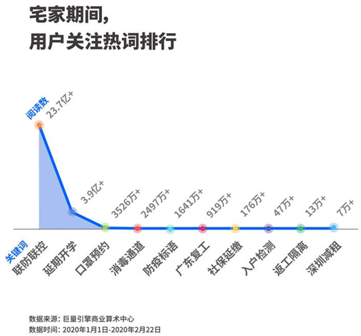 在1月1日至2月22日的頭條用戶閱讀數(shù)據(jù)中,聯(lián)防聯(lián)控、延期開學(xué)、口罩預(yù)約成為頭條平臺上最熱的關(guān)鍵詞前三位。此外、社保延繳、返工隔離等政府措施都被疫情下的手機用戶頻繁閱讀。