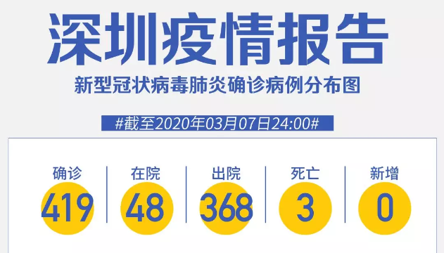 截至3月7日24時(shí),深圳累計(jì)報(bào)告“新冠肺炎”確診病例419例。3月7日當(dāng)天全市無(wú)新增確診病例,當(dāng)天出院病例7例(從2月26日起不再公布出院個(gè)案)。