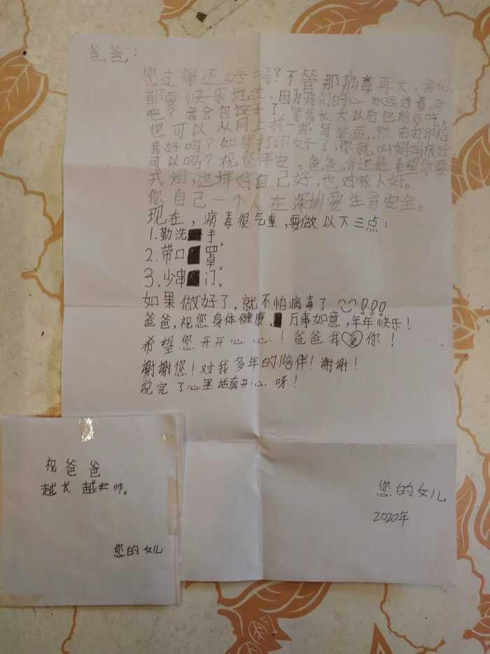 深圳晚報2020年3月9日訊 "爸爸:您過得還好嗎?不管那病毒再大,我們都要快樂地過,因為我們心連在一起……"日前,白云飛收到一封9歲女兒白家茵在高州老家給他郵寄的信件??粗畠喊l(fā)來的一行行文字,白云飛動容地說道,"原本答應她過年帶她去沙灘,聽到我說要提前回深圳與病毒作斗爭,還叮囑我一人在外注意安全。"紙短情長,他感覺自己的女兒長大了,他為女兒的堅強懂事而感動和自豪。"由于工作原因,爸爸需要提前回到工作崗位。等疫情過后,爸爸也抽時間好好陪你一下哈……"白云飛字里行間寫下了對女兒的愧疚之情。