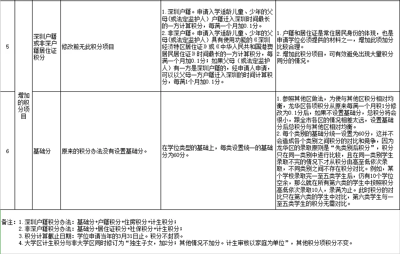 劃重點:政策內(nèi)或全面二孩擬不再加分,獨生子女加2分;深圳戶籍自購商品房產(chǎn)擬改為以房產(chǎn)購買日期計算積分;非深戶籍?dāng)M按照養(yǎng)老保險和醫(yī)療保險兩種險種同時繳納的時間計算積分;新增深圳戶籍或非深戶籍居住證積分;新增基礎(chǔ)分60分。
