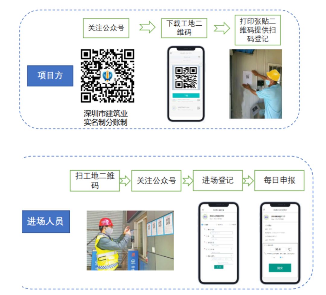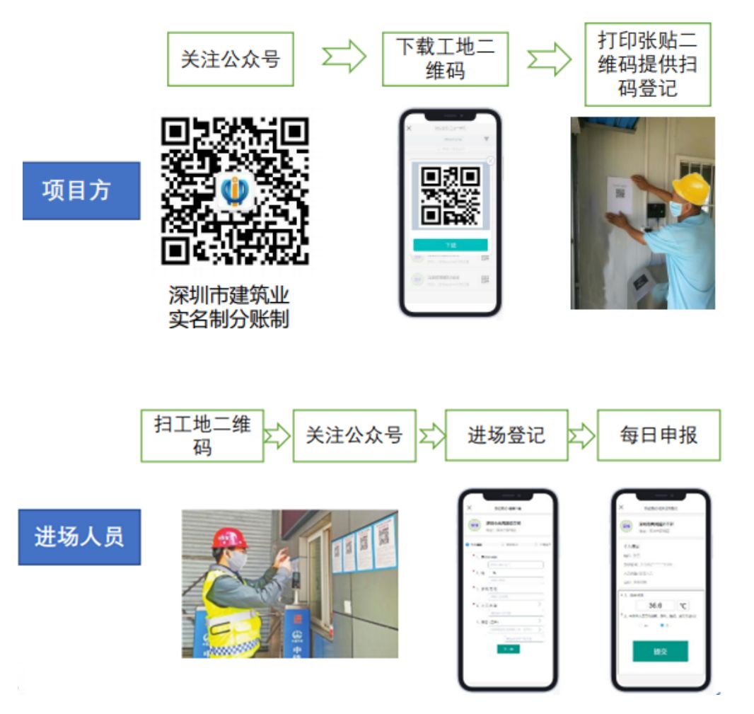 市場建設單位應關注深圳市建筑業(yè)實名制分賬制微信公眾號,獲取本工地的微信二維碼,并將工地二維碼張貼至工地公示區(qū)域。施工人員每日進場前測溫后,掃碼申報個人測溫結果和健康狀況。