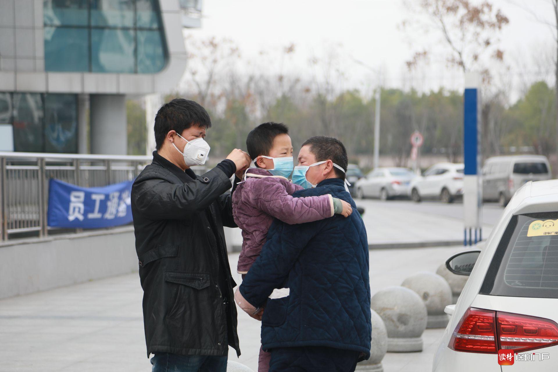 2月19日,監(jiān)利,一位父親幫助年幼的孩子戴口罩。