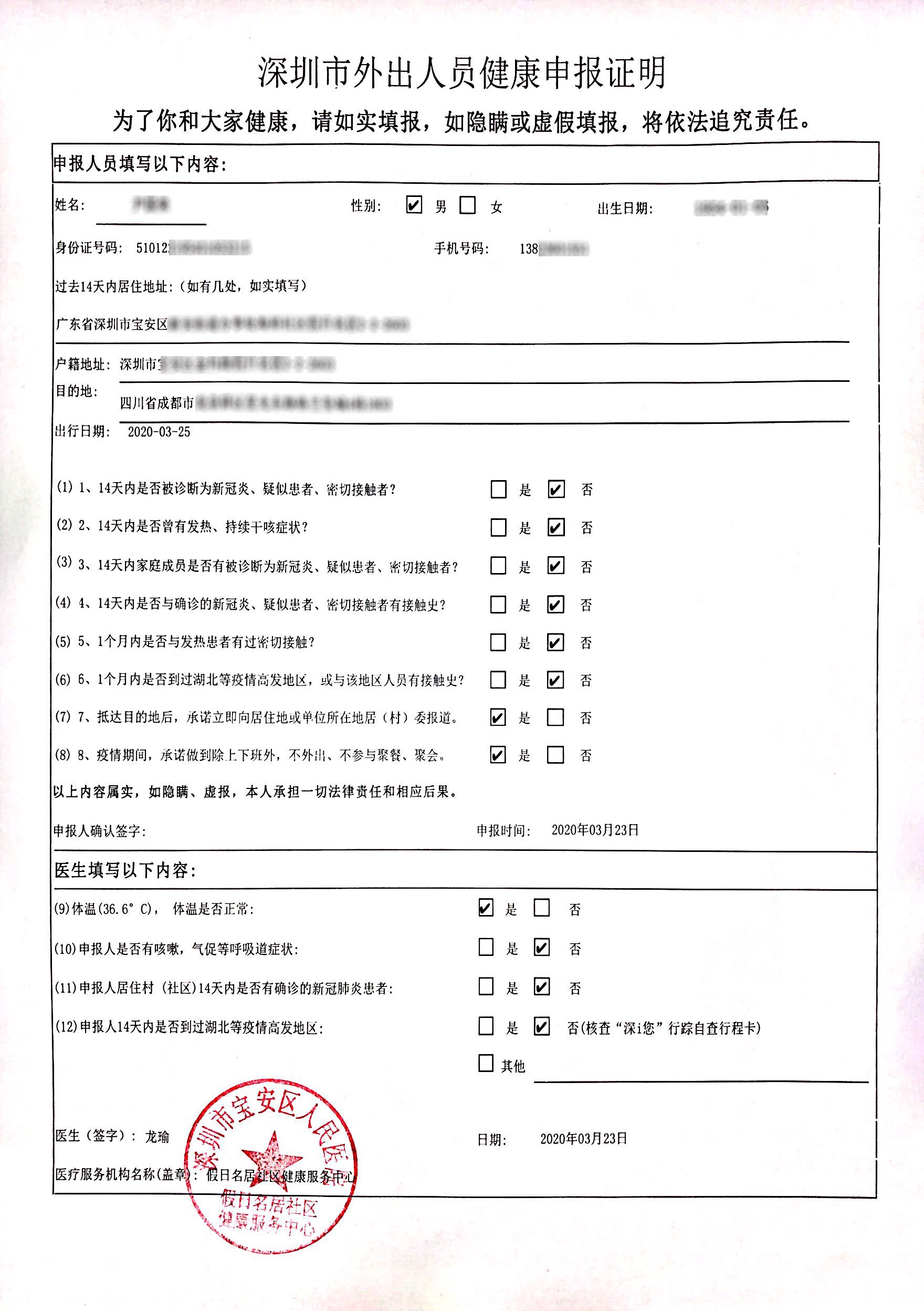 目前,深圳全市所有社康均可出具 《深圳市外出人員健康申報(bào)證明》。需要提醒的是,沒有微信的老人和小孩可由他人代填,此外,如果出行日期和目的地等有所變更,市民只需重新申報(bào)即可。