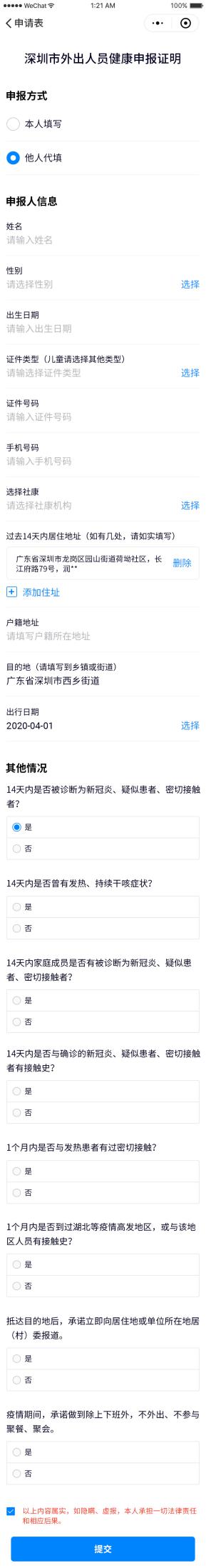 在具體操作上,市民可關(guān)注“深圳衛(wèi)健委”官方微信或“社康通”微信小程序,點(diǎn)擊“外出人員健康證明”,按要求填寫相關(guān)個(gè)人信息,選擇就近的社康中心以及出行目的地和出行時(shí)間,并選擇是否14天內(nèi)有過發(fā)熱、干咳,是否與新冠肺炎確診患者接觸等。在填寫完畢后,便可提交。