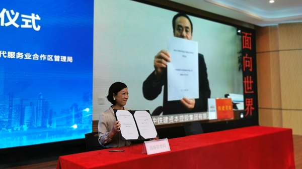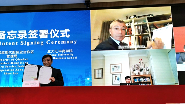 與以往不同,本次簽約儀式采用了現(xiàn)場簽約與視頻連線“云簽約”結(jié)合的特殊方式。前海管理局與中鐵建資本控股集團(tuán)有限公司,與國研科工、彩虹魚,與北京大學(xué)匯豐商學(xué)院、劍橋大學(xué)嘉治商學(xué)院的合作采用了“云簽約”。