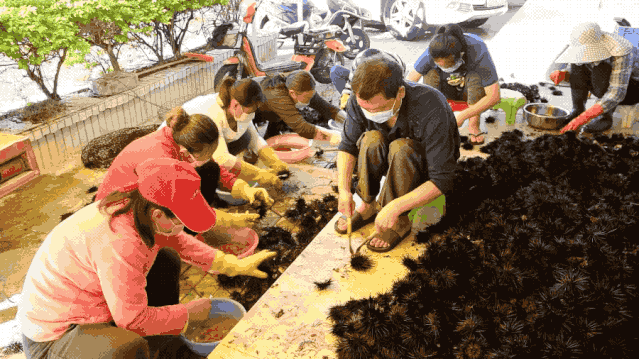 記者來(lái)到大鵬新區(qū)南澳海港路的潤(rùn)成海膽專(zhuān)賣(mài)店,看到工人們上下飛舞著鐵鉤“挖海膽”。南澳本地人口中所謂“挖海膽”就是海膽加工,打開(kāi)海膽殼,把海膽肉取出來(lái),然后用海水清洗干凈。從捕撈到上岸加工處理都必須一天之內(nèi)完成,只有嚴(yán)守時(shí)間的把控,爭(zhēng)分奪秒才配擁有鮮美和誘人的口感。