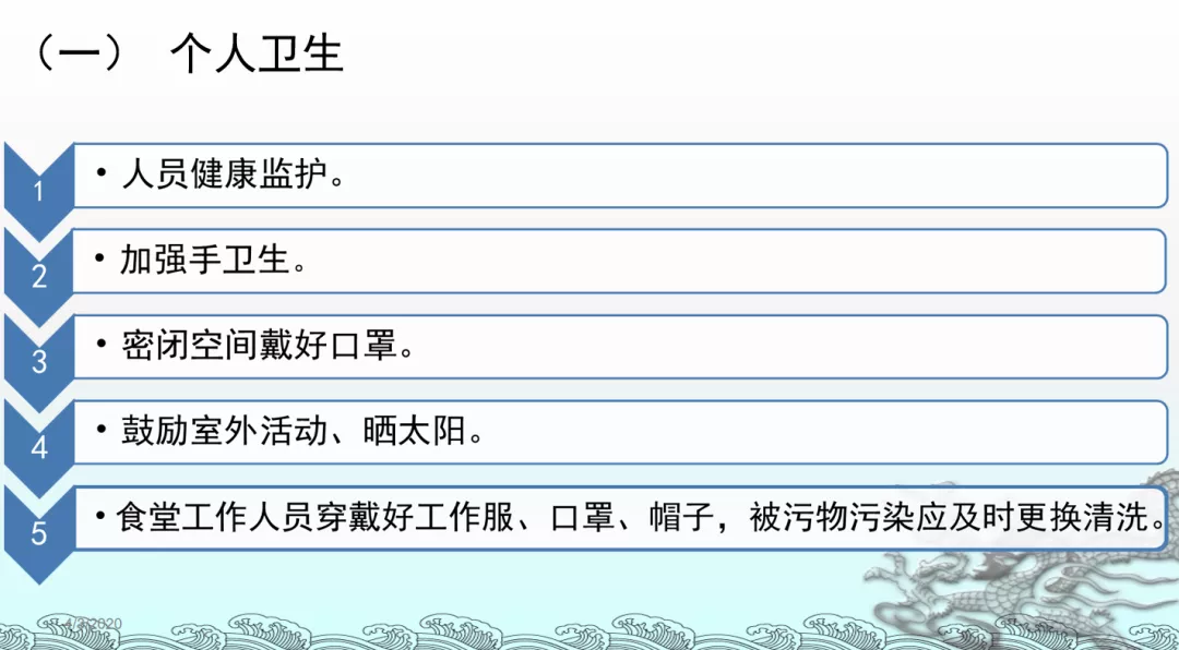 五是做好教育培訓(xùn)工作。學(xué)校要開(kāi)展多種形式的健康宣教,普及新冠肺炎防控知識(shí),組織師生學(xué)習(xí)教育部和市教育局下發(fā)的各類(lèi)指南和防疫知識(shí)。