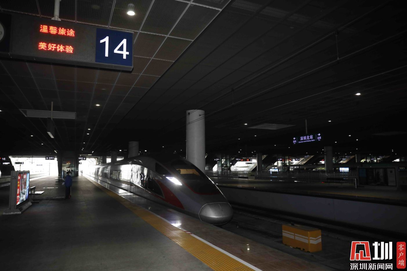 4月8日中午13點(diǎn)02分,G1005次高鐵到達(dá)深圳北站14站臺(tái)。