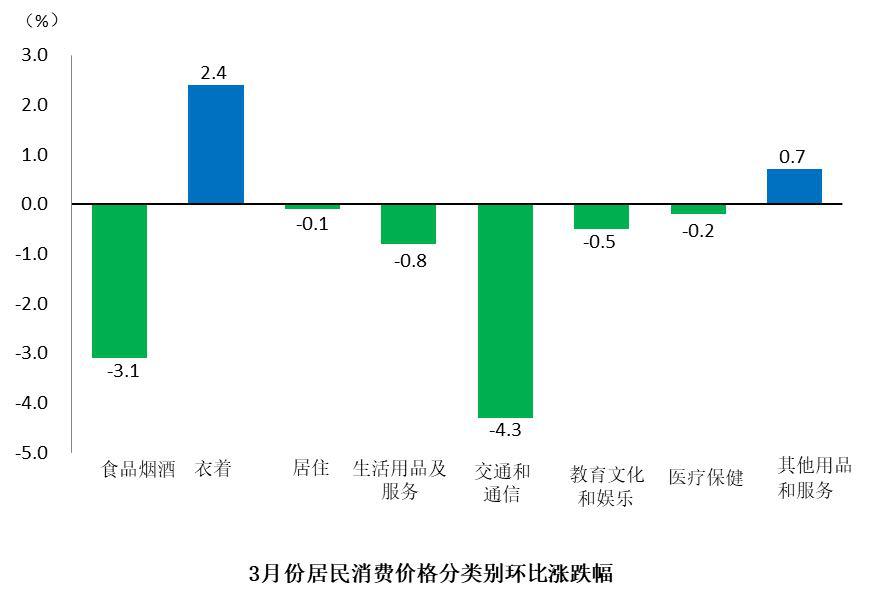 總體來看,食品價(jià)格環(huán)比下降4.3%,非食品價(jià)格環(huán)比下降0.7%;服務(wù)價(jià)格環(huán)比下降0.9%,消費(fèi)品價(jià)格環(huán)比下降1.9%。
