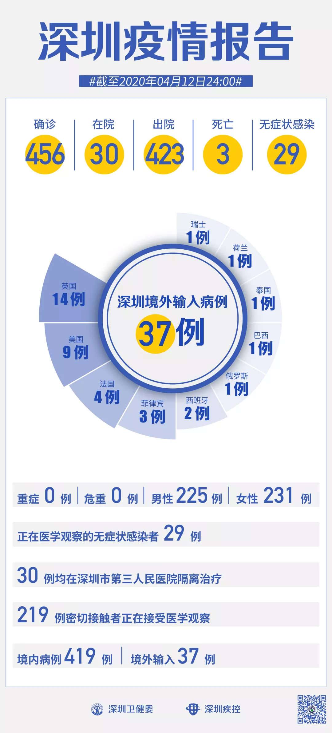 截至4月12日24時,深圳累計報告新冠肺炎病例456例。4月12日當(dāng)天新增無癥狀感染者1例。