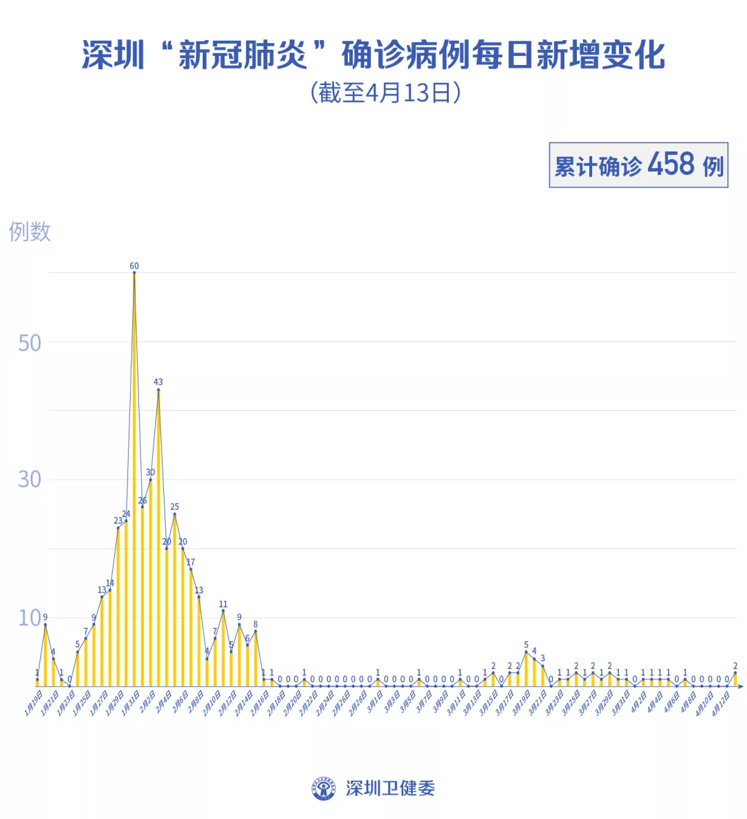 截至4月13日24時,深圳累計報告新冠肺炎病例458例。4月13日當(dāng)天新增2例境外輸入病例,新增無癥狀感染者1例,出院1例。