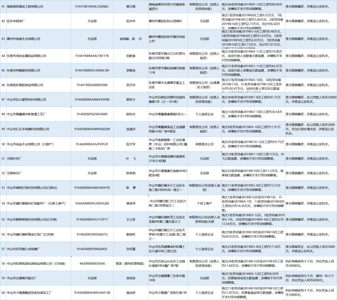 為加強(qiáng)對(duì)違法用人單位的社會(huì)監(jiān)督,強(qiáng)化誠(chéng)信體系建設(shè),加大威懾力,依據(jù)《廣東省用人單位重大勞動(dòng)保障違法行為社會(huì)公布暫行規(guī)定》,省人社廳公布2020年第一批重大違法案件,涉及81家企業(yè),其中深圳豬兼強(qiáng)互聯(lián)網(wǎng)科技有限公司拖欠138名勞動(dòng)者2019年5-6月工資約100.01萬(wàn)元,涉嫌拒不支付勞動(dòng)報(bào)酬罪,被責(zé)令限期整改,并移送公安機(jī)關(guān)。深港東成睡袋(深圳)有限公司拖欠327名勞動(dòng)者2019年6-7月工資約295.8萬(wàn)元,涉嫌拒不支付勞動(dòng)報(bào)酬罪,被責(zé)令限期整改,處以罰款人民幣4萬(wàn)元,并移送公安機(jī)關(guān)。