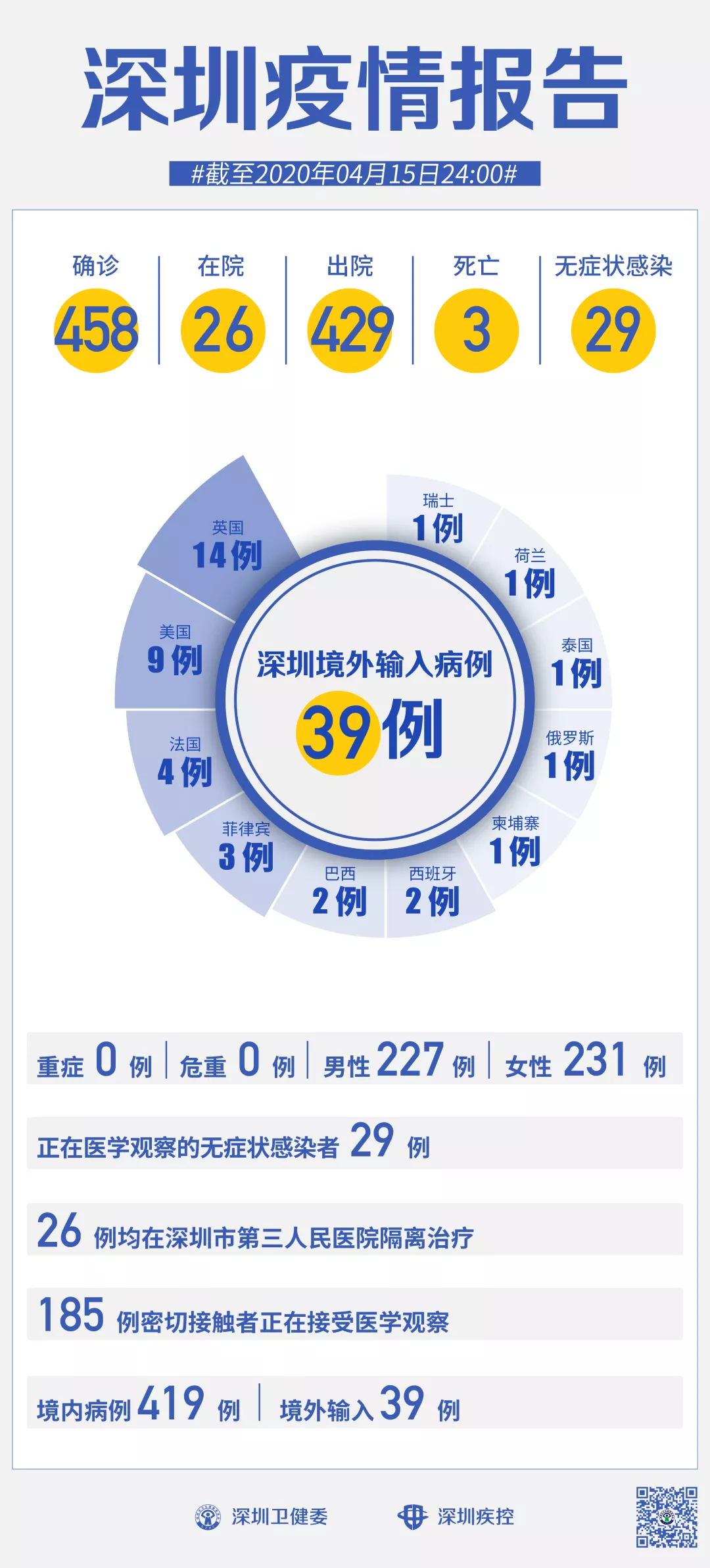 截至4月15日24時,深圳累計報告新冠肺炎病例458例。4月15日當(dāng)天新增出院2例。
