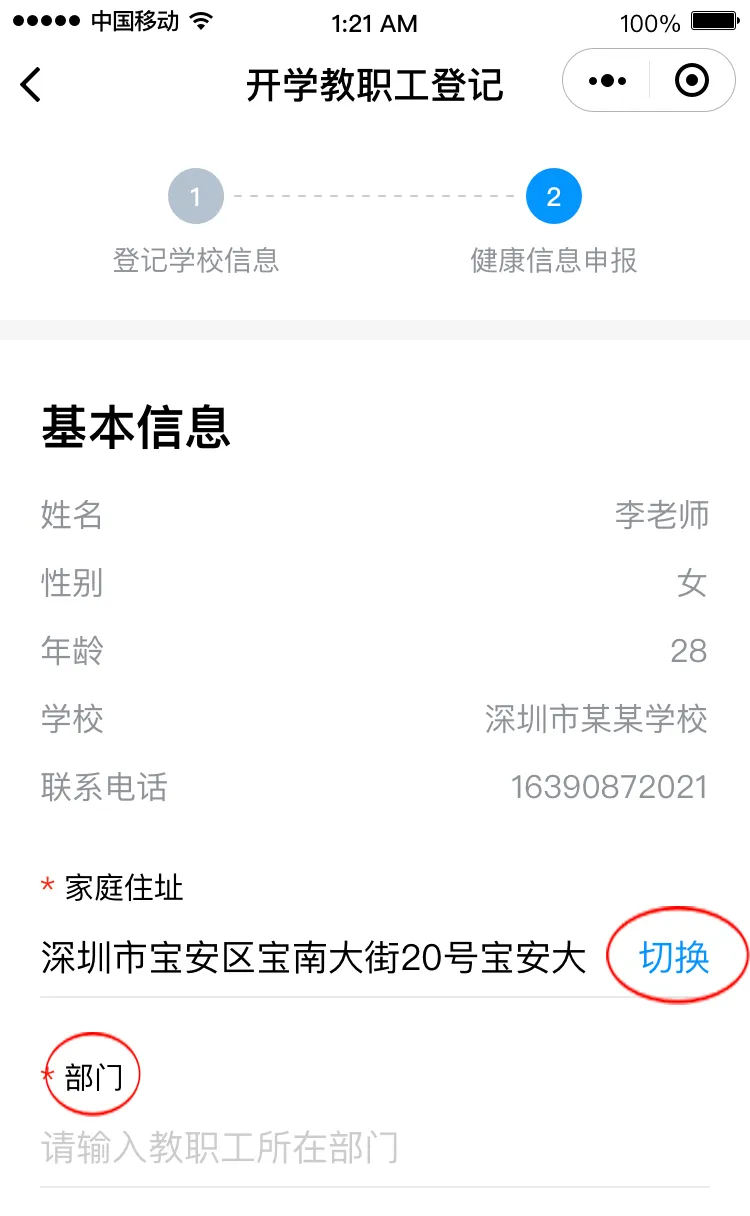請(qǐng)根據(jù)實(shí)際情況完成健康信息申報(bào),包括選擇家庭住址、填寫(xiě)所在部門(mén)、申報(bào)健康情況。