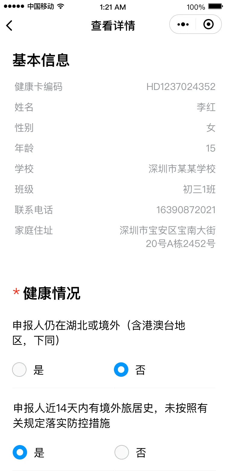請(qǐng)根據(jù)實(shí)際情況完成健康信息申報(bào),包括選擇家庭住址、申報(bào)健康情況、填寫(xiě)監(jiān)護(hù)人姓名。