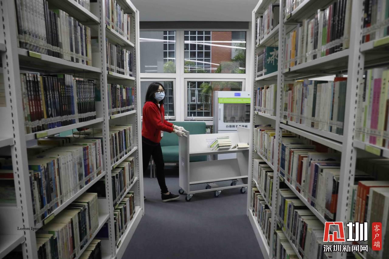 工作人員正在對(duì)福田圖書館的書做消毒處理。