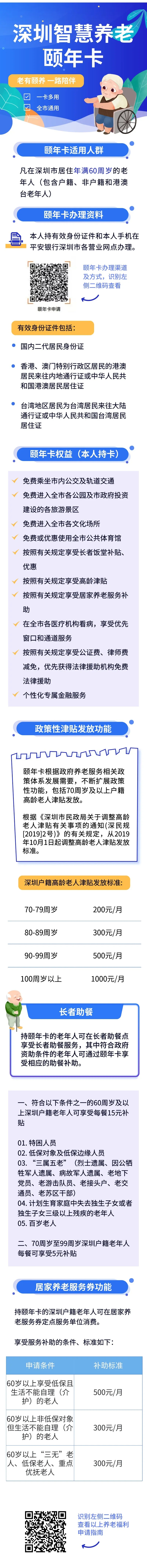 據悉,凡在深圳市居住年滿60周歲以上的老年人(包含港澳臺老年人),均可持有效身份證件和手機申請辦理。“頤年卡”持卡人,可享受敬老優(yōu)待,包括免費進入全市各公園,免費進入市政府投資建設各旅游景區(qū),免費乘坐市內公交車和軌道交通。70周歲及以上戶籍老人還可享受高齡津貼發(fā)放;符合規(guī)定的戶籍老年人可享受居家養(yǎng)老消費的優(yōu)惠和補貼,包括:生活照料、家政服務、康復護理服務、日托服務、心理咨詢等。