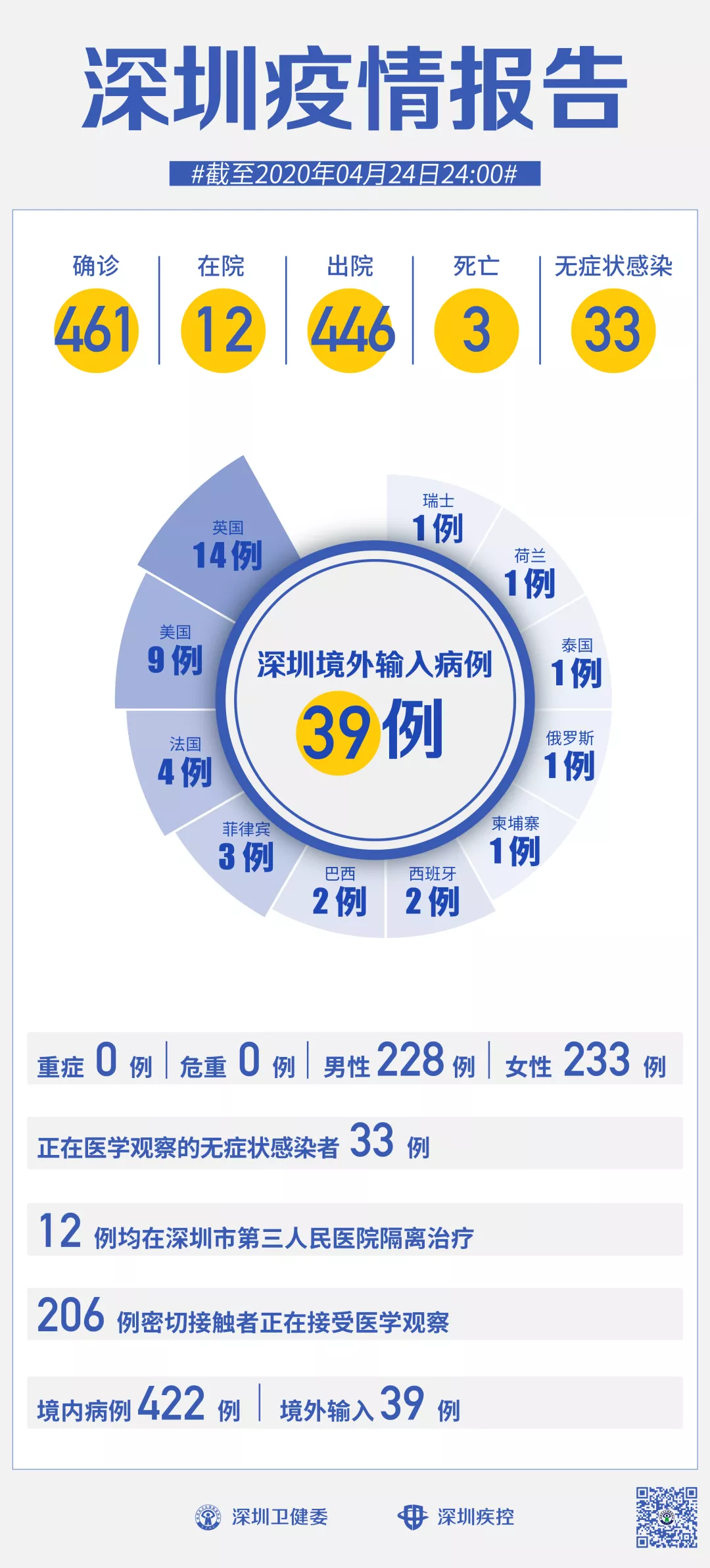 截至4月24日24時,深圳累計報告新冠肺炎病例461例。4月24日當天新增出院1例。