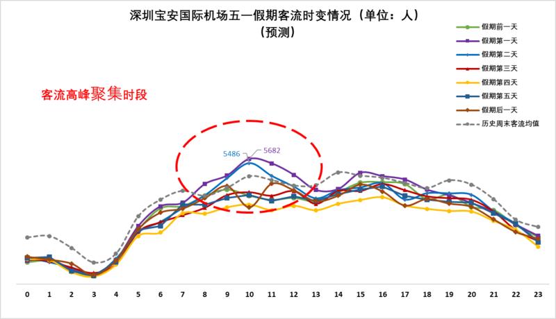 ▲預(yù)計深圳寶安機(jī)場5月1日(假期第一天)、5月2日(假期第二天)的上午時段較易出現(xiàn)當(dāng)日客流高峰。