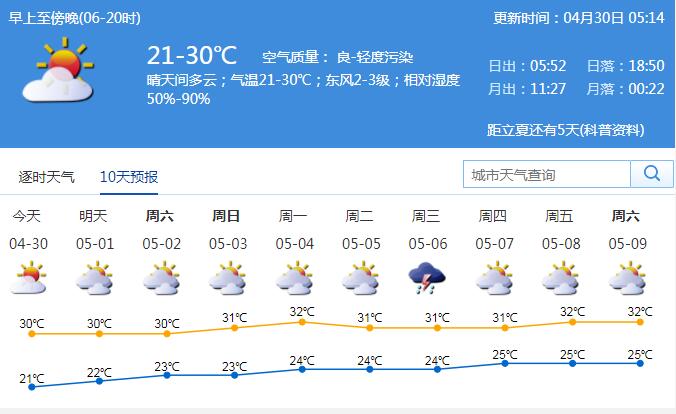 見圳客戶端·深圳新聞網(wǎng)2020年4月30日訊 我市今天晴天間多云,氣溫21-30℃;東風(fēng)2-3級,相對濕度50%-90%。五一假期期間(5月1-5日)天氣總體平穩(wěn),以多云為主,早晚有輕霧,其中5日前后偶有短時陣雨;假期期間最高氣溫可達(dá)31-32℃,中午前后天氣炎熱。森林火險(xiǎn)氣象等級較高,要注意用火安全;注意防暑防嗮。