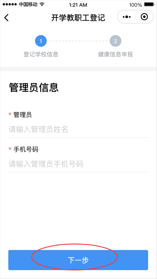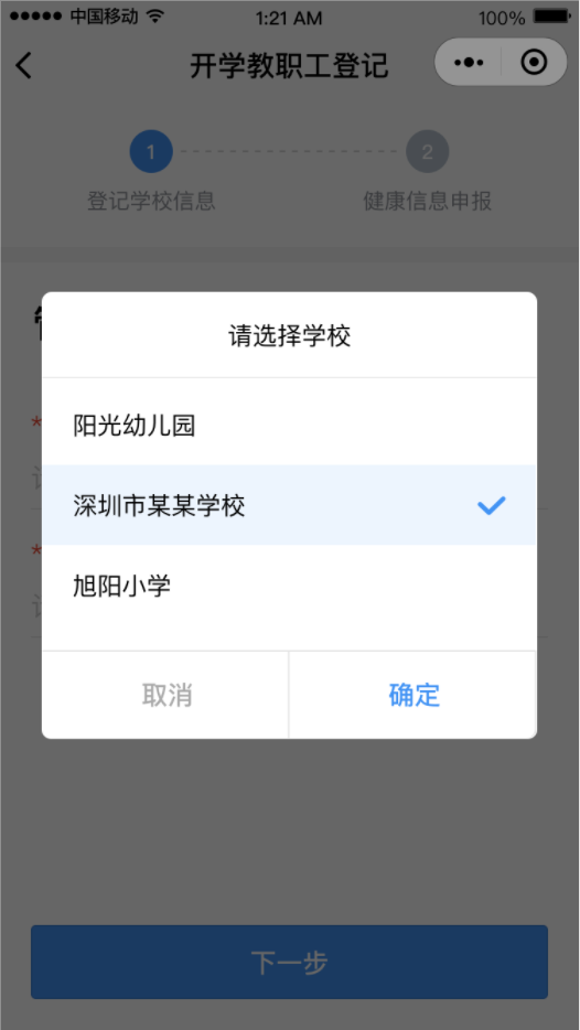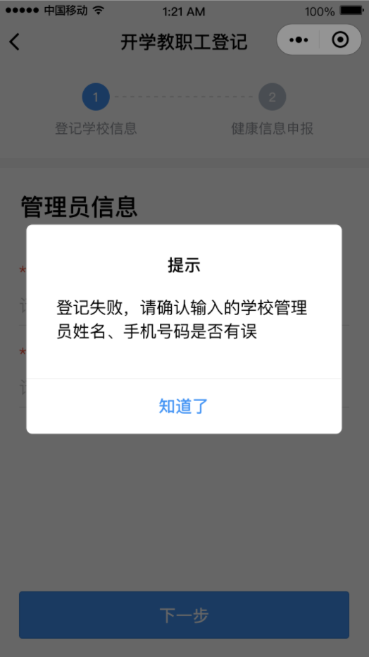 ②點(diǎn)擊“馬上登記”按鈕,填寫(xiě)學(xué)校管理員姓名和手機(jī)號(hào)碼(學(xué)校管理員姓名和手機(jī)號(hào)碼請(qǐng)?jiān)儐?wèn)學(xué)校獲得)后點(diǎn)擊“下一步”,然后選擇對(duì)應(yīng)的學(xué)校。