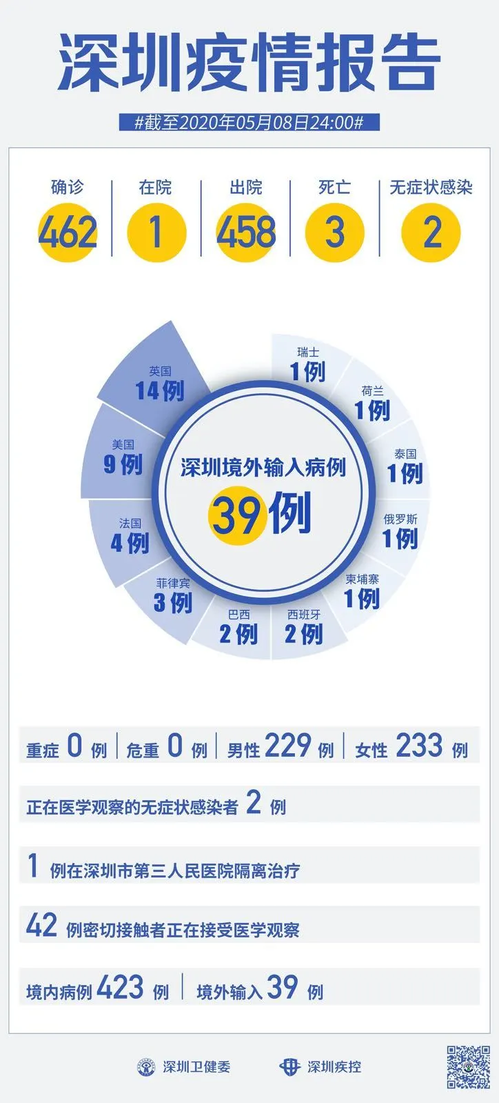 截至5月8日24時,深圳累計報告新冠肺炎病例462例。