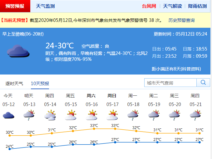 見圳客戶端·深圳新聞網(wǎng)2020年5月12日訊 深圳昨夜雷電+大風(fēng)黃色+暴雨黃色預(yù)警齊生效,市氣象臺(tái)于2020年05月11日23時(shí)30分在全市取消暴雨黃色、大風(fēng)黃色預(yù)警。預(yù)計(jì)12日白天多云間陰天,有陣雨。13日陣雨轉(zhuǎn)多云,天況逐漸轉(zhuǎn)好,14-17日多云為主,陽光充足,天氣再趨炎熱。