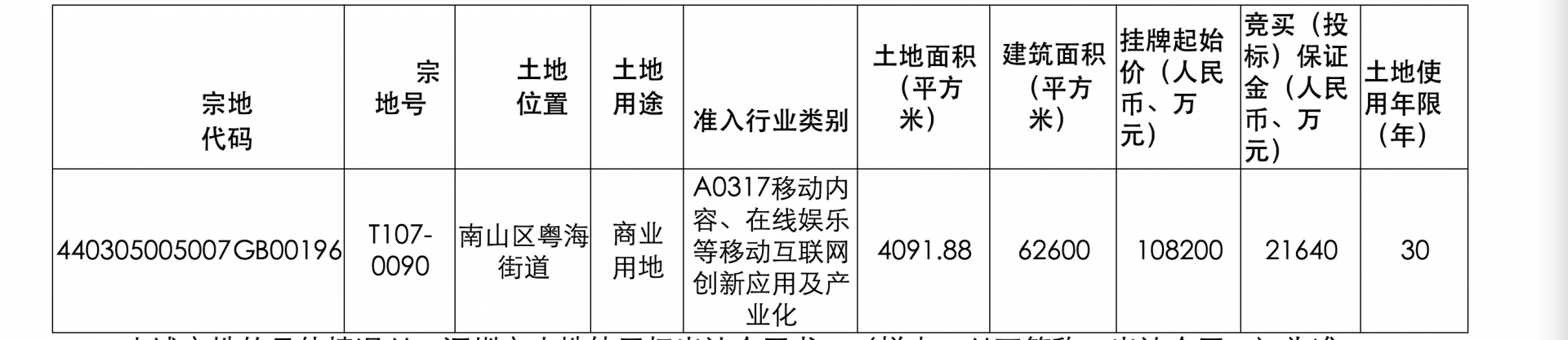根據(jù)公告,T107-0090宗地位于南山區(qū)粵海街道創(chuàng)業(yè)路,后海河畔,土地用途為商業(yè)用地,準(zhǔn)入類別為A0317移動(dòng)內(nèi)容、在線娛樂等移動(dòng)互聯(lián)網(wǎng)創(chuàng)新應(yīng)用及產(chǎn)業(yè)化,土地面積4091.88平方米,建筑面積62600平方米,容積率:≤15.3,掛牌起始價(jià)108200萬元,土地使用年限30年。掛牌期自2020年6月3日起至2020年6月12日15時(shí)止。