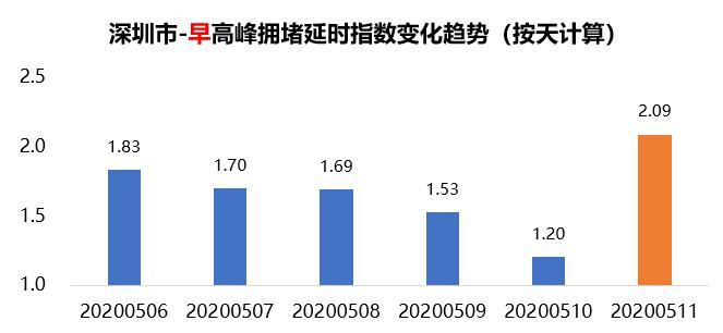 此外,隨著廣州和深圳部分年級開學復課,疊加通勤出行需求,統(tǒng)計數據顯示,5月11日廣深兩市均迎來最堵早高峰,其中8:00-9:00時段擁堵程度最高,早高峰擁堵延時指數分別為1.9和2.09。而晚高峰方面,從5月6日至5月11日數據來看,廣州和深圳在5月8日的擁堵程度最高,晚高峰擁堵延時指數分別為2.10和2.00。