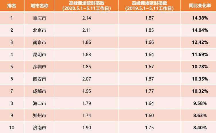根據高德地圖監(jiān)測的50個主要城市交通數據顯示,5月1日至11日工作日相比2019年同期,重慶、北京、南京、昆明的高峰擁堵延時指數漲幅較大,同比變化率均超過11%,深圳、西安、成都同比變化率也超過10%。