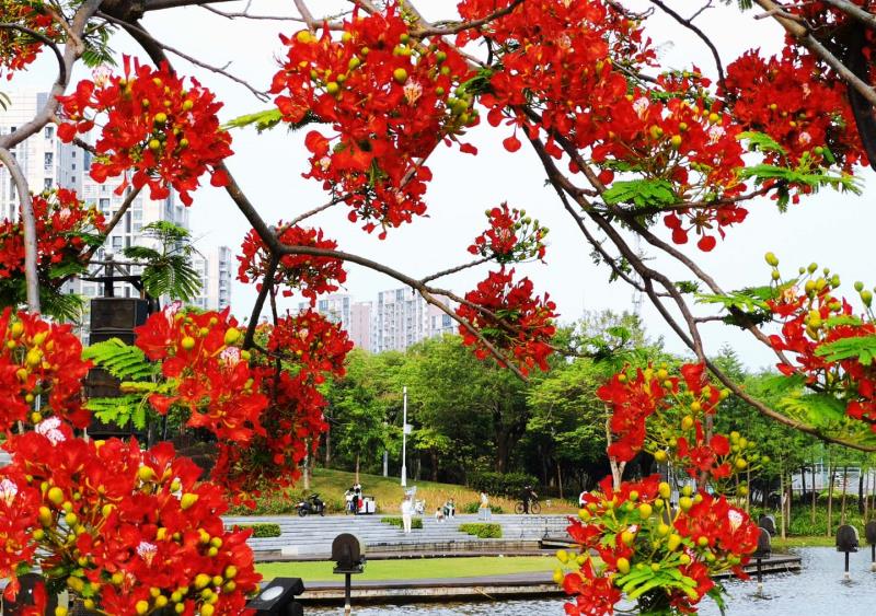鳳凰木又名火樹、紅花楹,由于其開花時"葉如飛凰之羽,花若丹鳳之冠",因而得名「鳳凰樹」。每年5月至7月,是鳳凰樹開花的時節(jié)。在鵬城公園、道路兩旁到處可見鳳凰花盛開,當下鳳凰花開正燦爛,錦簇花團紅似火,成為鵬城亮麗的風景線。圖為龍崗大運中心鳳凰樹花開吸引市觀賞拍照。