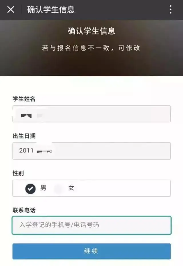 輸入入學(xué)登記手機(jī)號碼,確認(rèn)學(xué)生信息。