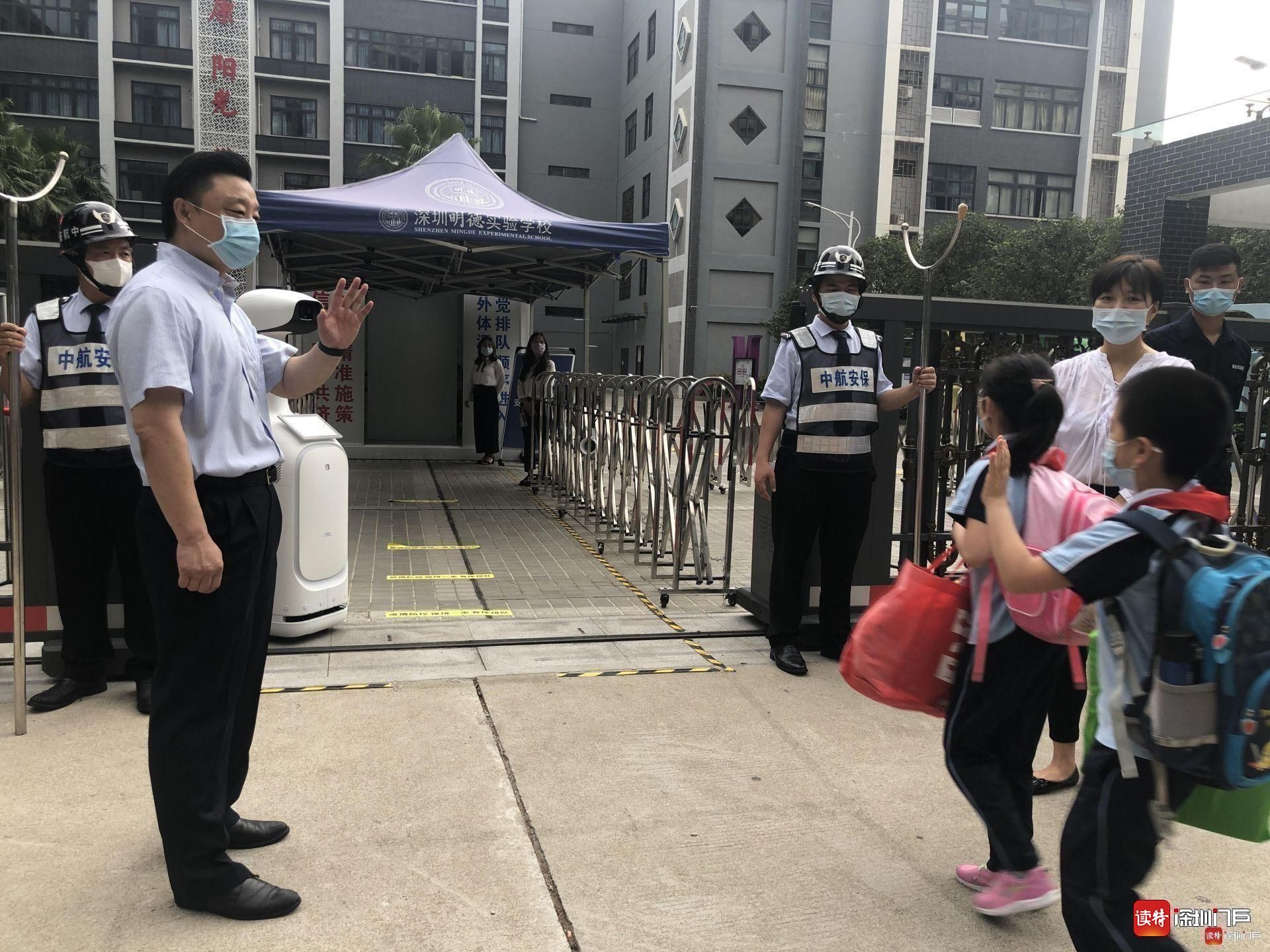 “同學(xué)們好!”“歡迎回來!”從7點起,明德實驗學(xué)校校長魯江與工作人員就在香蜜校區(qū)校門口迎候?qū)W生們,提醒孩子們戴好口罩,也與家長們交流返校事宜。校門口的一臺超氧水消殺機(jī)器人也在積極投入工作,工作人員在后臺控制面板可以監(jiān)測到入校人員的體溫情況。