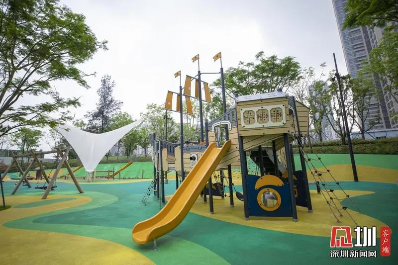 林下棧道兒童活動區(qū),有趣味滑板、游戲沙池、以及盤旋而上的空中棧道,蟲鳴魚躍,鳥語花香,是親子互動的浪漫花園。