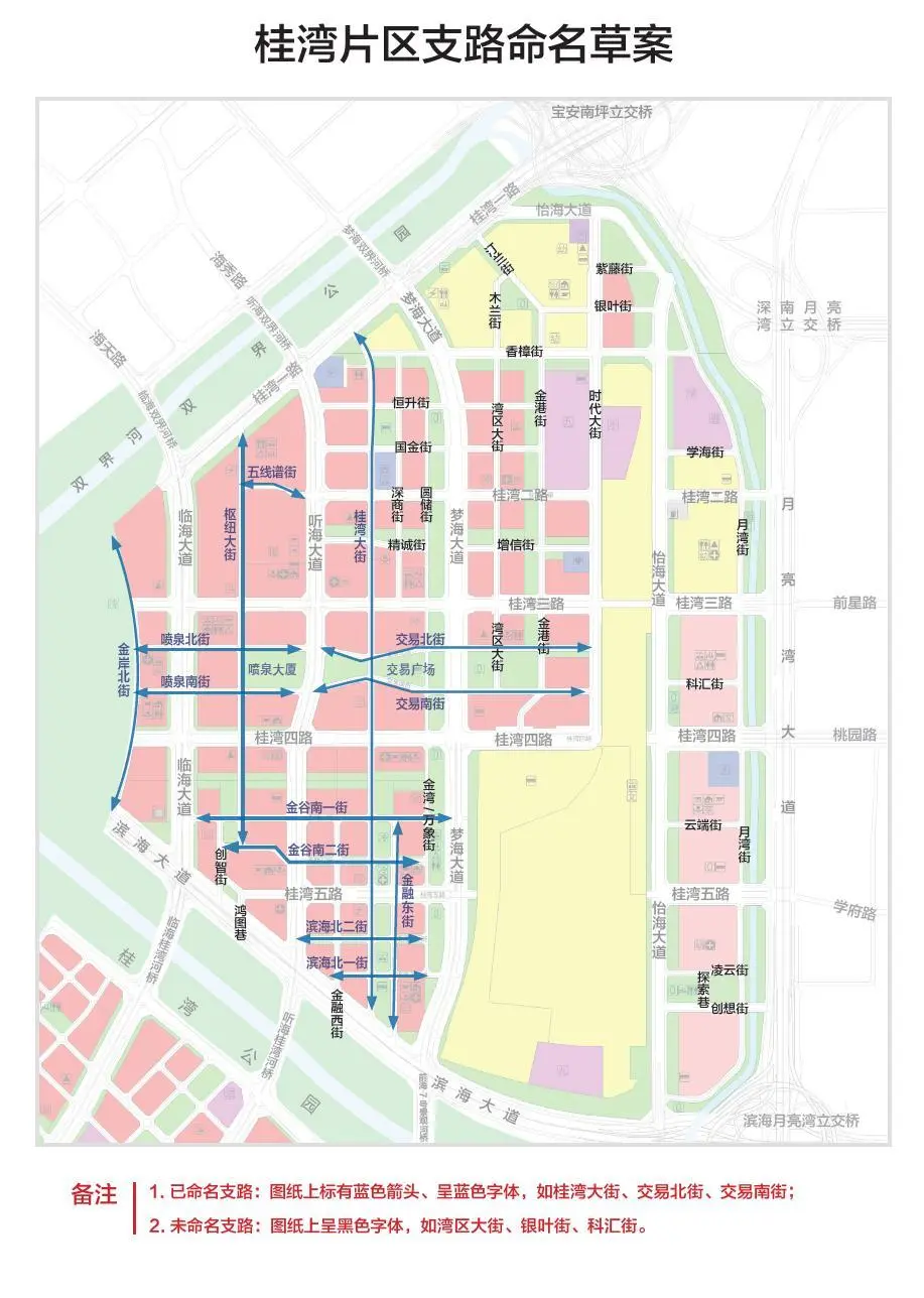 本次命名草案按照相關(guān)法規(guī)文件,結(jié)合前海桂灣、前灣、媽灣各片區(qū)的規(guī)劃定位、功能布局以及建設情況,針對三大片區(qū)和重要功能區(qū)功能、項目布局等特征,對前海15平方公里支路進行了全覆蓋命名。