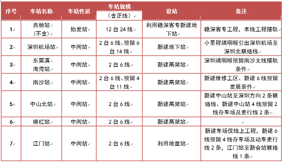 項(xiàng)目共設(shè)西麗(不含)、深圳機(jī)場、濱海灣、南沙、中山北、橫欄、江門等7個車站,其中西麗、深圳機(jī)場為地下站,濱海灣、南沙、中山北、橫欄為高架站,江門站為地面站。