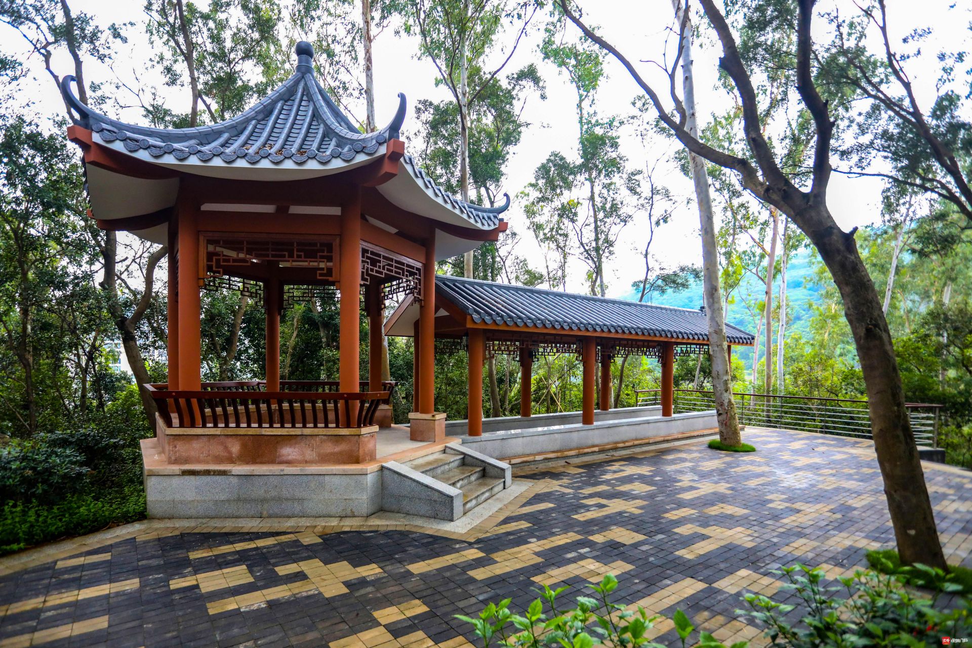 聽濤區(qū)南入口位臨梅林路,北入口位臨二線公路,交通便利,周邊住宅區(qū)多,人口稠密。為了給市民游客提供良好的綜合性服務(wù),公園依據(jù)山體自然地形修建了觀景平臺(tái)、避雨亭廊、公共廁所等基礎(chǔ)設(shè)施。同時(shí),作為以山林為主體的公園,在保證基礎(chǔ)服務(wù)設(shè)施完備的基礎(chǔ)上,公園以植物造景為主,縮減鋪裝面積,盡量不破壞地表植被和自然景觀,最大限度地保留其自然風(fēng)韻。景區(qū)內(nèi)植被茂盛,綠意盎然,山風(fēng)吹拂,綠濤波動(dòng),呼應(yīng)“聽濤”的主題。