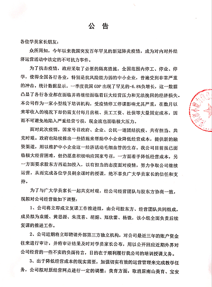 公告稱,公司成立由股東和老師組成的復(fù)課工作推進(jìn)組,申請(qǐng)?jiān)缛諒?fù)課,時(shí)間初定于6月中旬;并將聘請(qǐng)外部第三方獨(dú)立機(jī)構(gòu)審計(jì)賬戶資金,澄清不實(shí)經(jīng)營傳言;還將取消寶安、南山兩個(gè)經(jīng)營網(wǎng)點(diǎn),所有美育學(xué)生安排去福田上課。