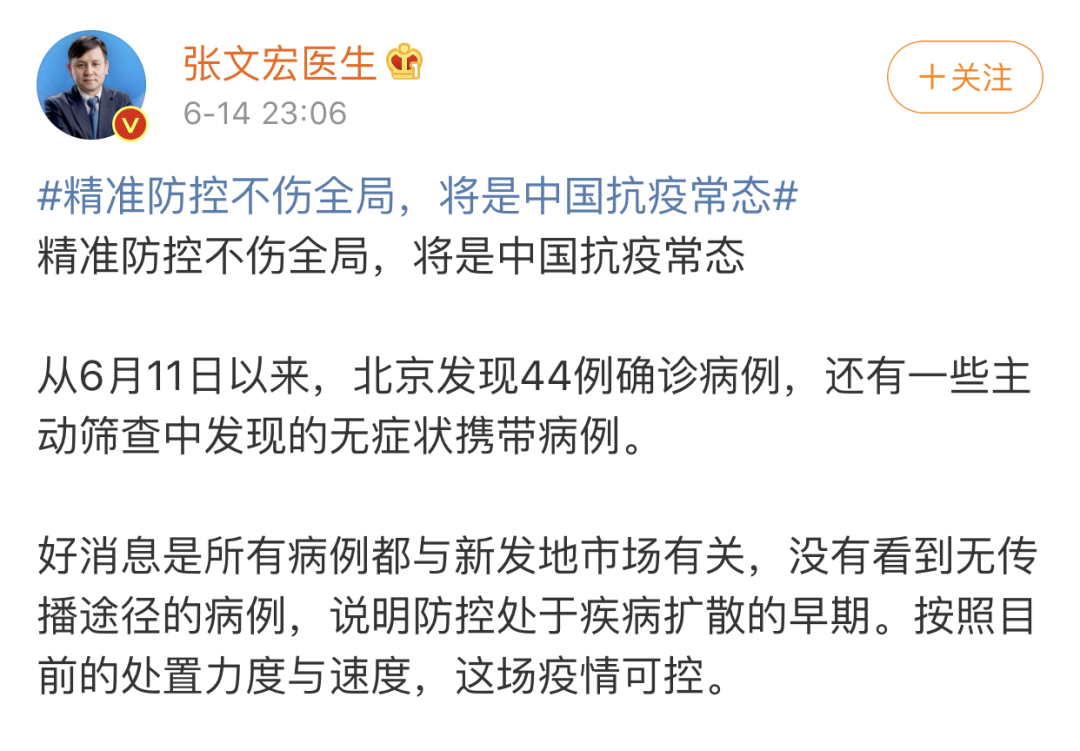 6月14日,張文宏醫(yī)生在微博上發(fā)布了名為《精準防控不傷全局,將是中國抗疫常態(tài)》的文章,針對北京近日新發(fā)的新冠疫情,他是這么說的: