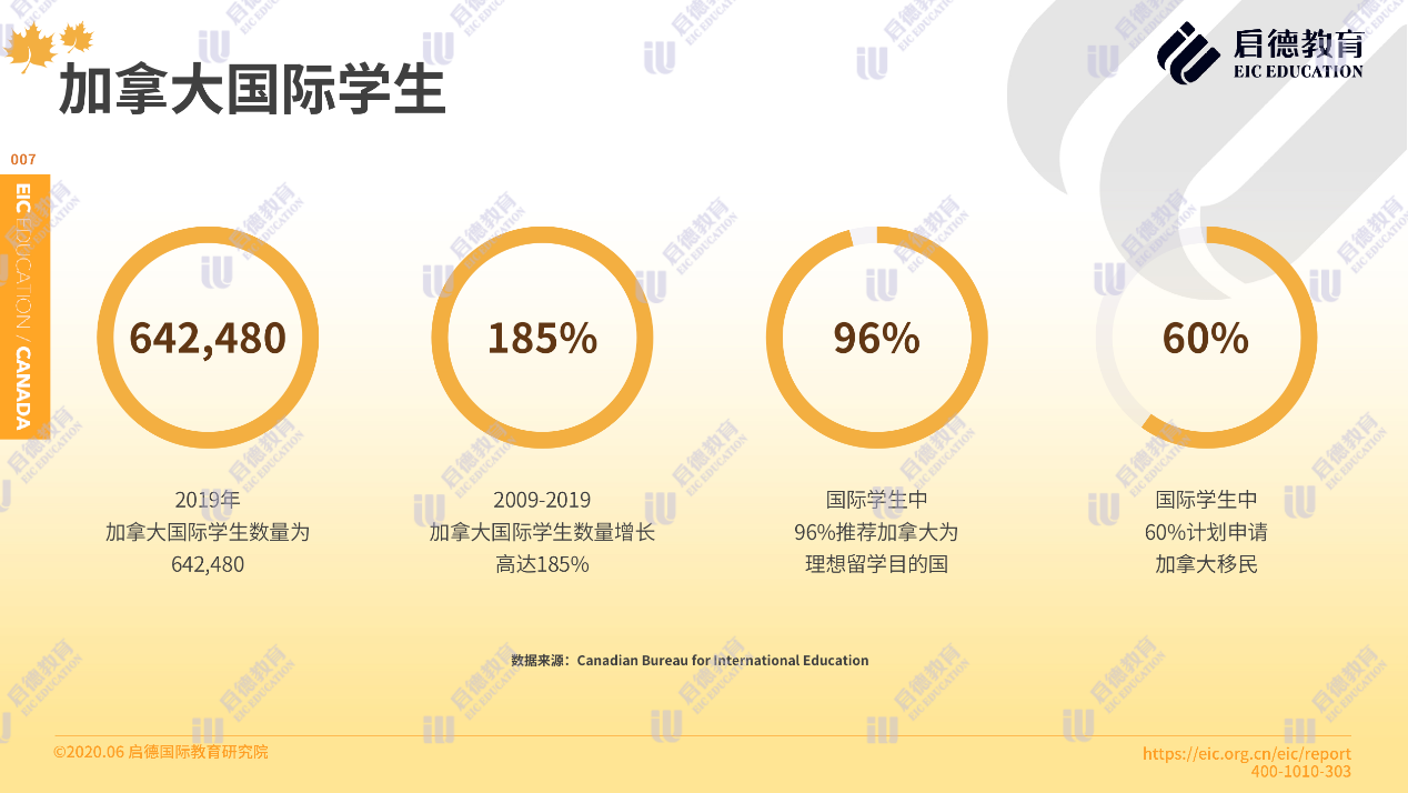 加拿大國際教育局( Canadian Bureau for International Education )數(shù)據(jù)顯示,2019年加拿大國際學(xué)生數(shù)量為642480人,2009-2019加拿大國際學(xué)生數(shù)量增長率達(dá)到185%。加拿大統(tǒng)計(jì)局?jǐn)?shù)據(jù)顯示,截至2019年12月31日,加拿大留學(xué)生人數(shù)最多的三個(gè)省為安大略省(306,735 )、英屬哥倫比亞省(144,675 )、魁北克?。?7,280 ),增長率相比2018年分