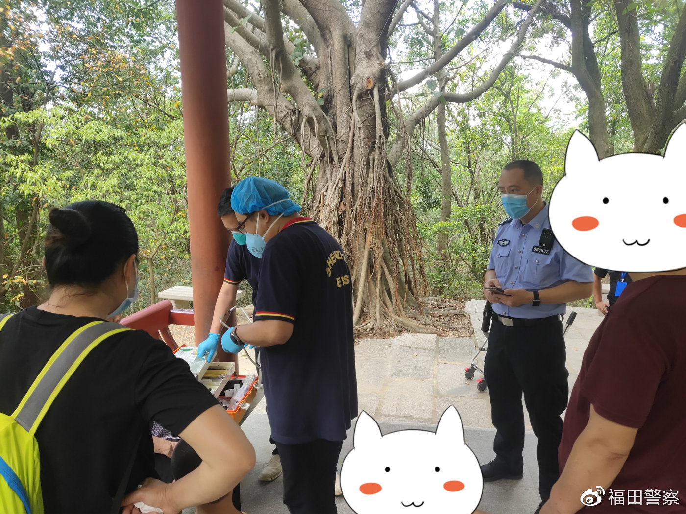 13時許,接派出所前臺指令,報稱一老人身體不適請求幫助后,民警立即趕到現(xiàn)場,協(xié)助120醫(yī)務(wù)人員進(jìn)行檢查。檢查完畢后,民警為老人遞上一杯水,并在確認(rèn)老人身體無礙后,將其護送下山。
