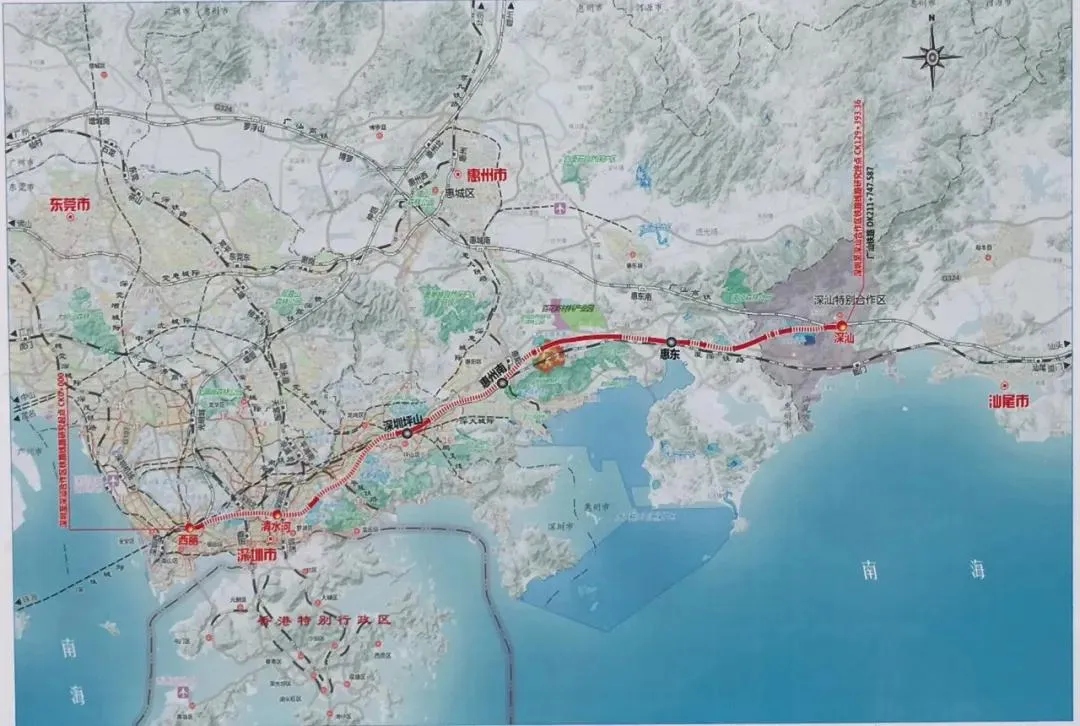 深汕高鐵:起自西麗站,經(jīng)南山區(qū)、羅湖區(qū)、龍崗區(qū)、坪山區(qū)、惠州市至深汕特別合作區(qū)深汕站,銜接廣汕鐵路,全長(zhǎng)127公里。