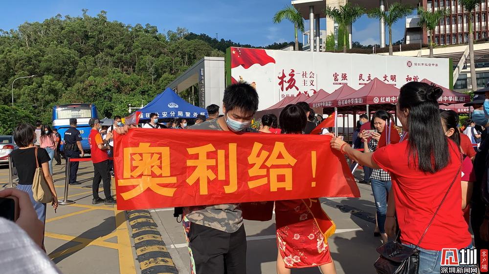 【紅嶺中學(xué)】考生學(xué)長(zhǎng)來(lái)到考點(diǎn)門(mén)口為學(xué)弟舉起“奧利給”的旗子。