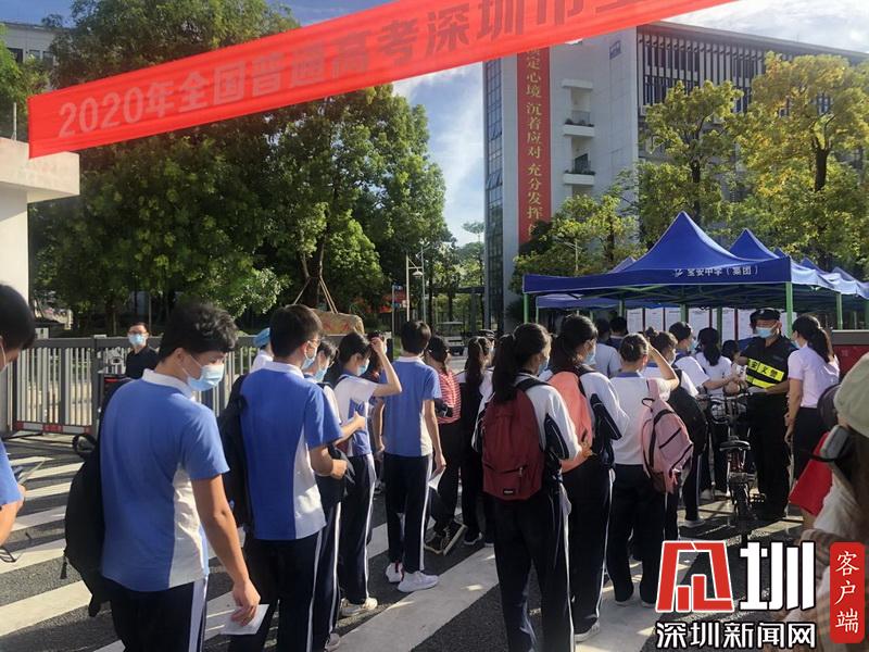 考生們有序排隊,等待進入考場。
