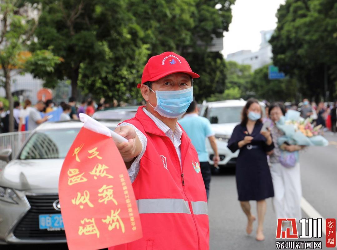 深圳高級中學(xué)考點外家長受捧鮮花、滿懷期待。