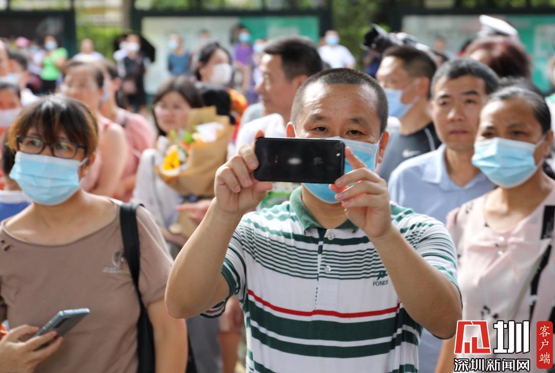 家長(zhǎng)舉起手機(jī),靜候于深圳高級(jí)中學(xué)考點(diǎn)門(mén)口。