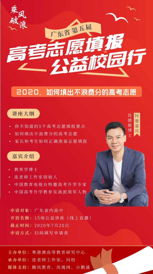 見圳客戶端·深圳新聞網(wǎng)2020年7月9日訊 (記者 陳彬)高考是每一位高三學(xué)子夢(mèng)想的起點(diǎn),但高考不只是一場(chǎng)考試,還有考試之后的志愿填報(bào);如何科學(xué)、專業(yè)的填報(bào)志愿,直接關(guān)系著考生能否獲得心儀大學(xué)和專業(yè)的錄取。7月6日,以《2020,如何填出不浪費(fèi)分的高考志愿》為主題的廣東省第五屆高考志愿填報(bào)公益校園行正式啟動(dòng),該活動(dòng)由粵港澳高等教育研究中心主辦,連老師工作室承辦,將面向廣東省內(nèi)高中,以學(xué)?;虬嗉?jí)為單位,舉辦15場(chǎng)志愿填報(bào)公益講座,講座全程特邀連德敏博士擔(dān)任主講嘉賓。