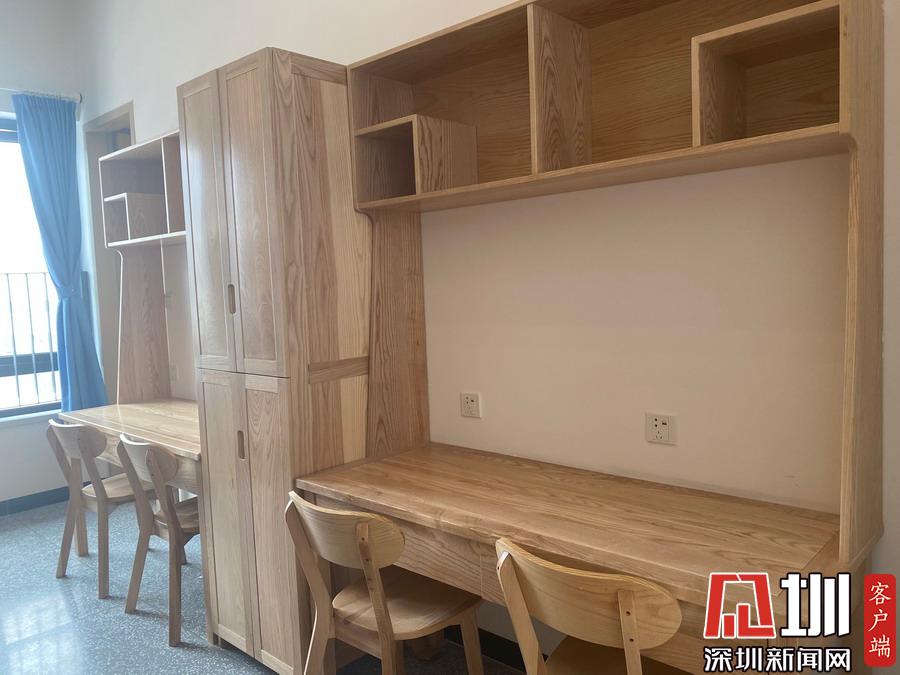宿舍樓內(nèi),每套學(xué)生宿舍41.8平方米,采用2+1模式,2個(gè)獨(dú)立的房間各居住4人,一個(gè)共用衛(wèi)生間。一方面做到干濕分區(qū),臥室舒適度更好;另一方面做到學(xué)生分散,臥室靜謐性更好。同時(shí),室內(nèi)家具均采用“全實(shí)木+環(huán)保水性漆”,包括床、衣柜、書(shū)桌、書(shū)柜與椅子等;每一層宿舍樓均設(shè)有觀景平臺(tái)。此外,宿舍配備空調(diào),太陽(yáng)能熱水器,并在每棟宿舍二樓都設(shè)置了自助洗衣房。