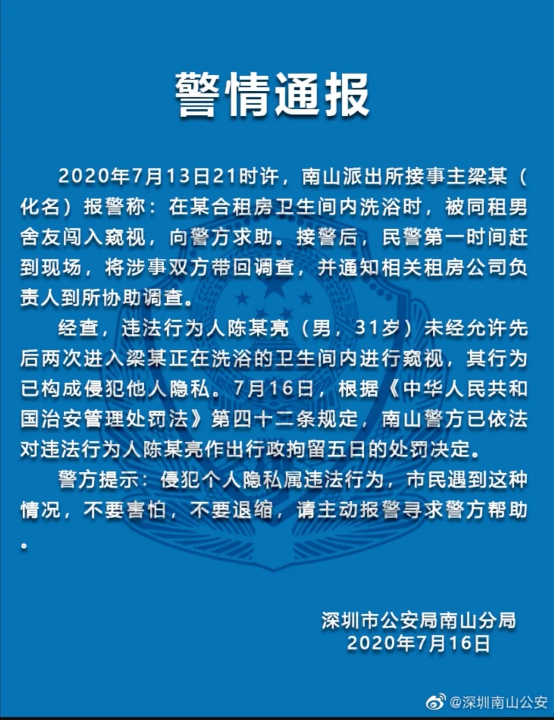 蛇口消息報2020年7月16日訊 7月16日,南山警方發(fā)布對“女生合租房衛(wèi)生間洗浴被同租男舍友闖入”事件的警情通報,違法行為人陳某亮(男,31歲)行為已構(gòu)成侵犯他人隱私,南山警方已依法對陳某亮作出行政拘留5日的處罰決定。